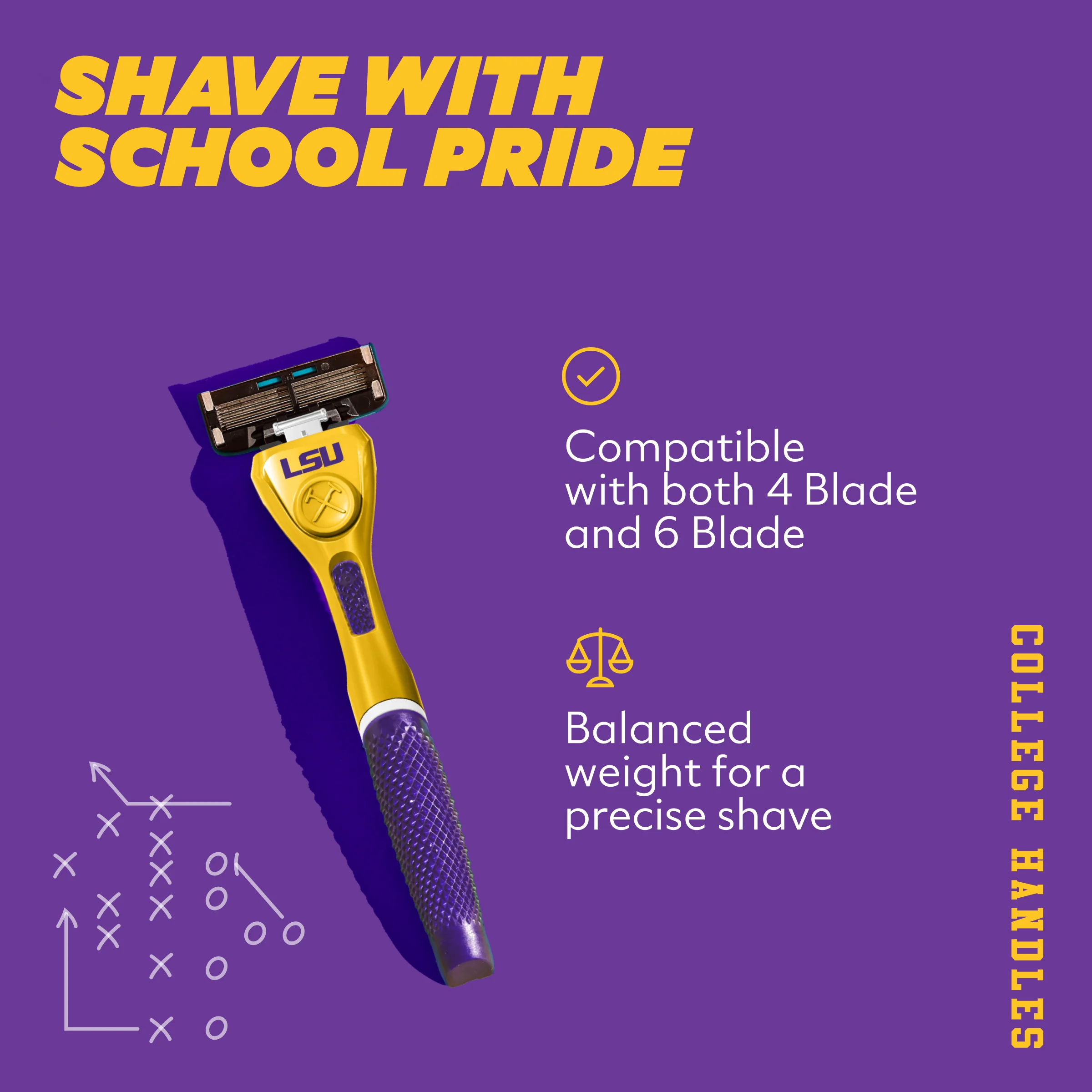 Your team. Your colors. Our limited-edition collegiate handles are built to rep school spirit from the sink to the stadium. Whether you go with our 4 Blade or 6 Blade cartridge, both are compatible with this weighty, diamond-patterned grip handle designed for ultimate comfort and control.