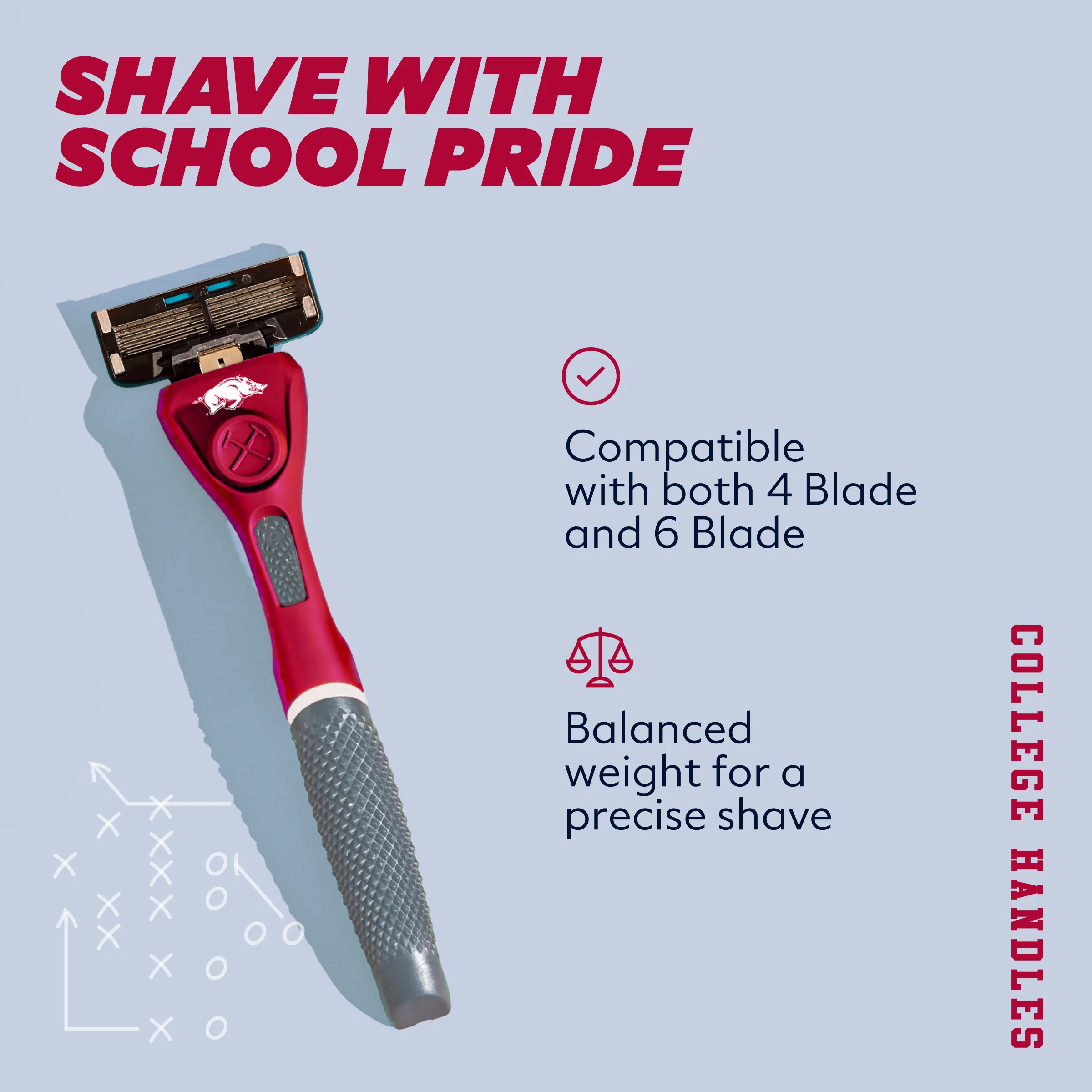 Your team. Your colors. Our limited-edition collegiate handles are built to rep school spirit from the sink to the stadium. Whether you go with our 4 Blade or 6 Blade cartridge, both are compatible with this weighty, diamond-patterned grip handle designed for ultimate comfort and control.