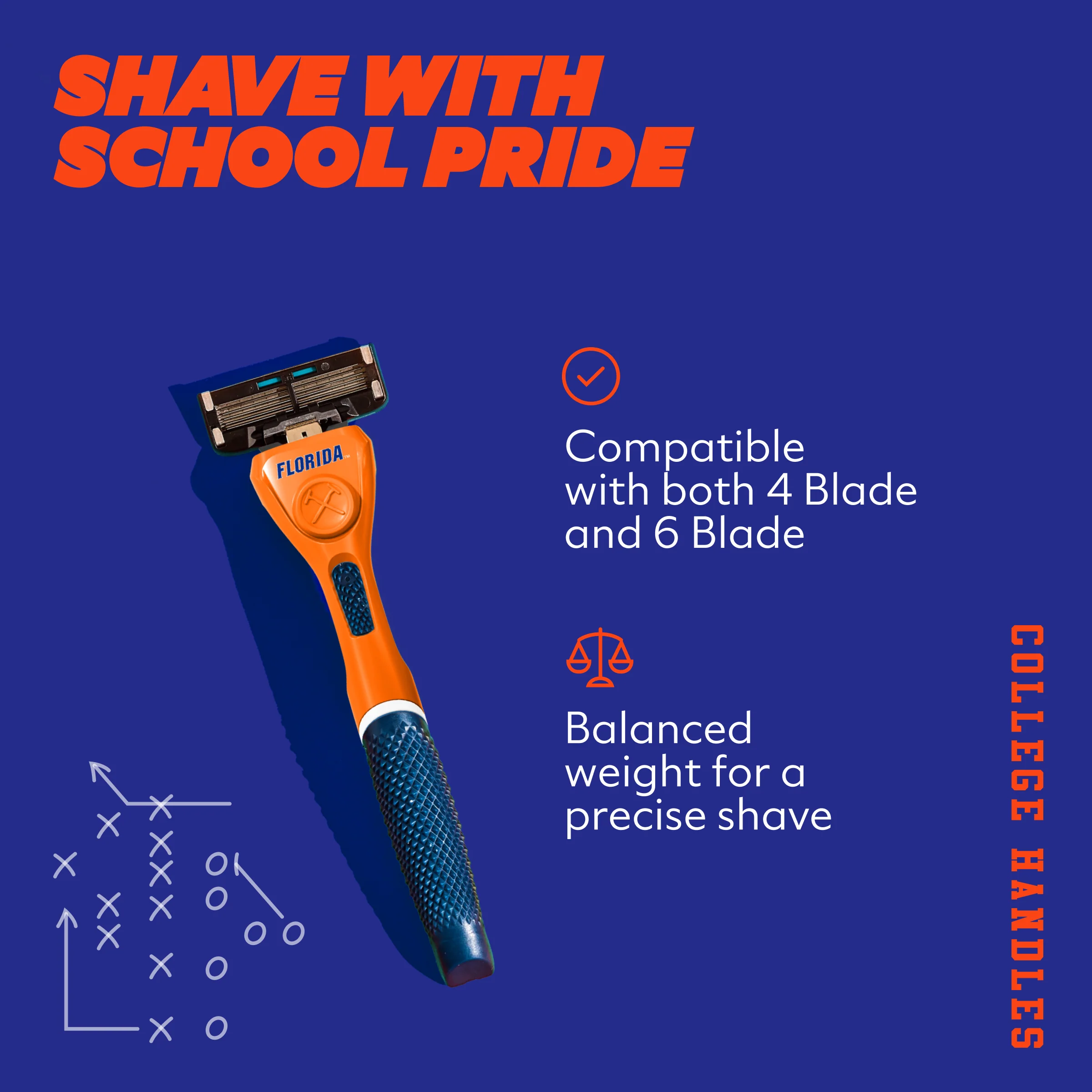 Your team. Your colors. Our limited-edition collegiate handles are built to rep school spirit from the sink to the stadium. Whether you go with our 4 Blade or 6 Blade cartridge, both are compatible with this weighty, diamond-patterned grip handle designed for ultimate comfort and control.