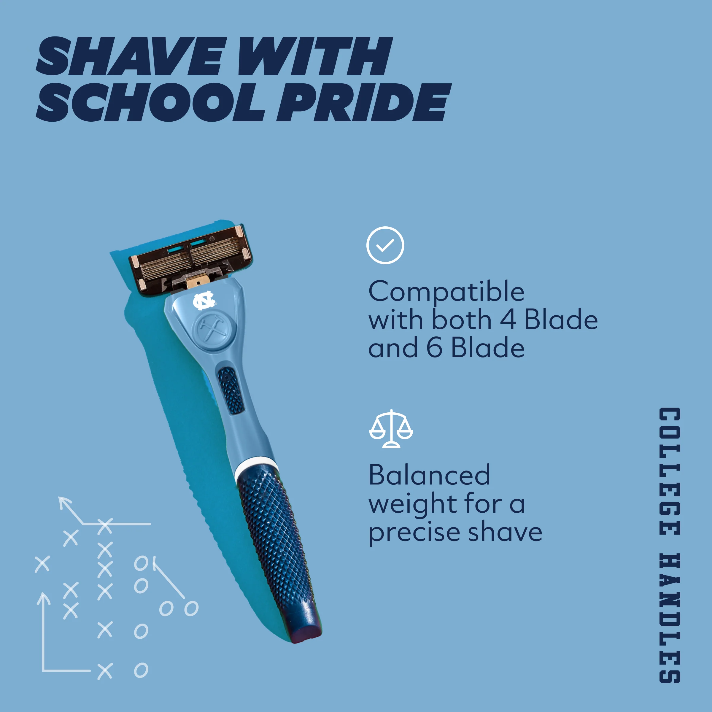 Your team. Your colors. Our limited-edition collegiate handles are built to rep school spirit from the sink to the stadium. Whether you go with our 4 Blade or 6 Blade cartridge, both are compatible with this weighty, diamond-patterned grip handle designed for ultimate comfort and control.